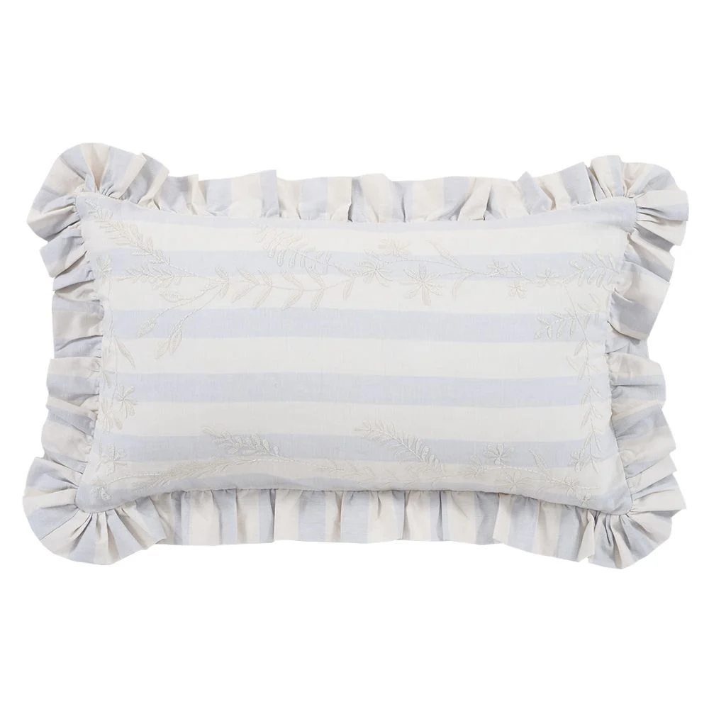 Almofada Anne 30x50cm, a combinação de listras com delicados bordados em ramos florais realça o modelo com sofisticação e elegância. E os babados na moldura complementam o design, conferindo harmonia e refinamento